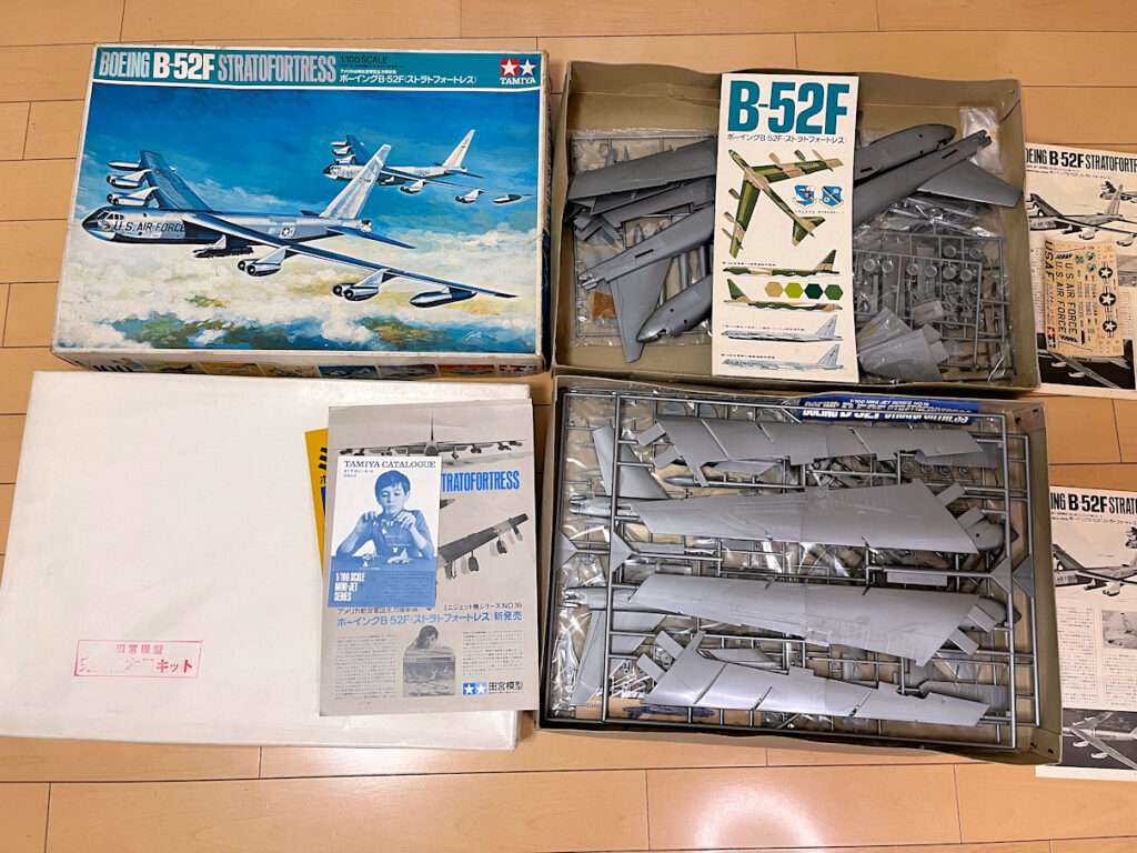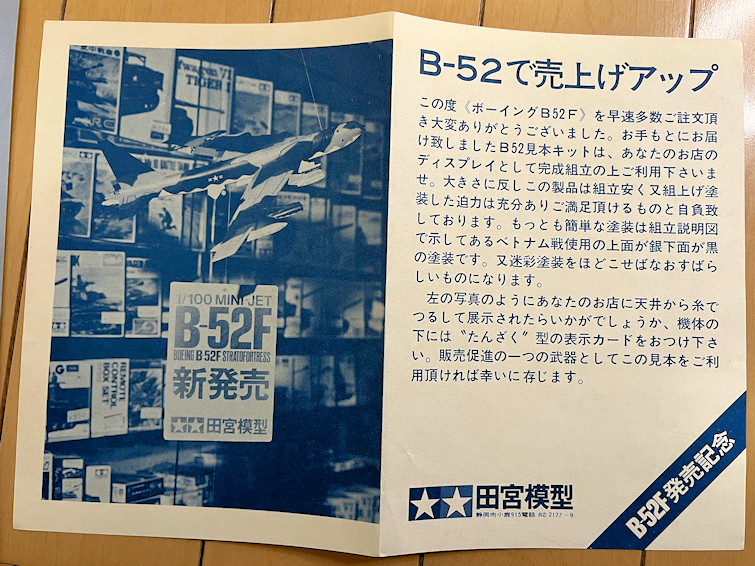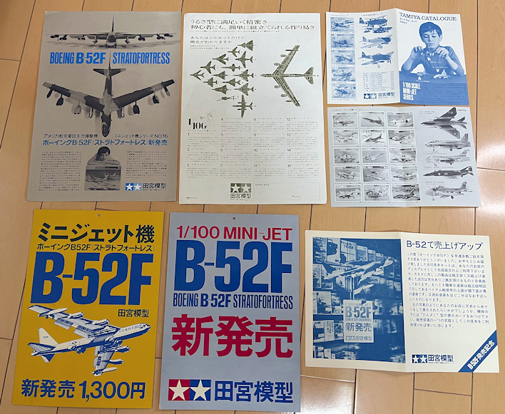 下の1つ目の写真が白箱に同梱されていたチラシ類です。内訳は、B-52Fのチラシ2枚、タミヤカタログ2枚、店頭吊るし用POP 2枚、ディスプレイ方法を解説した説明書1枚。